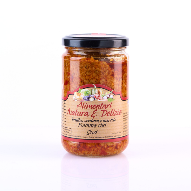 Un mix piccante a base di verdure e peperoncino calabrese, ideale per chi ama i sapori intensi. Ottima da spalmare su bruschette, crostini o per insaporire primi e secondi piatti. Preparata artigianalmente con ingredienti naturali e olio d’oliva.