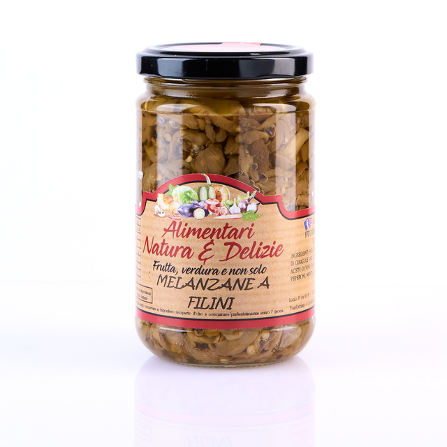 Ingredienti: melanzane 71%, olio di girasole 14%, olio di oliva 14%, aceto di vino bianco, origano, peperoni, menta, sale.